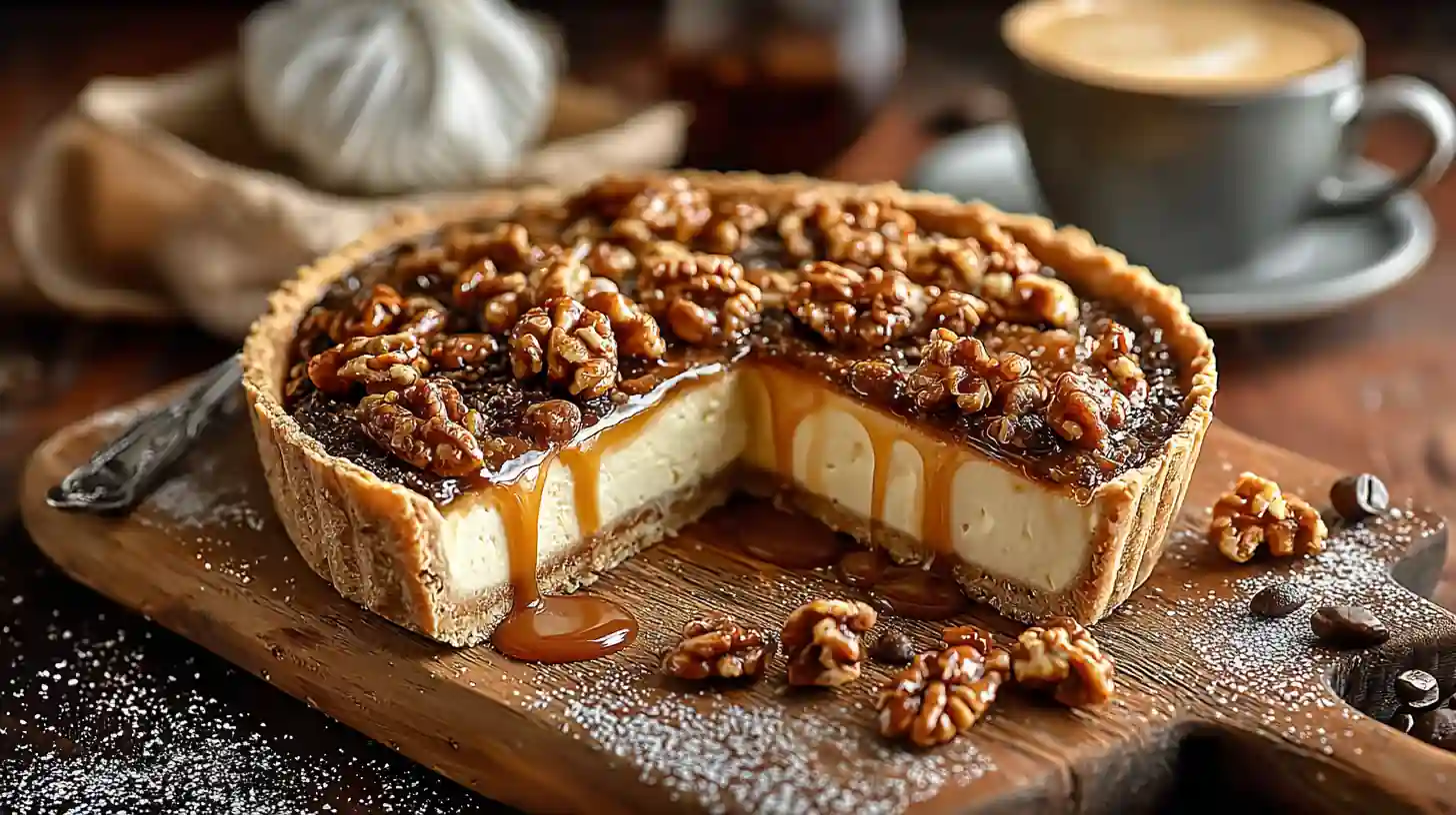 Cette tarte aux noix et au café est une vraie pépite gourmande. Entre la douceur d’une crème onctueuse au mascarpone légèrement parfumée au café, et le croquant généreux des noix caramélisées, chaque bouchée offre une explosion de textures et de saveurs. C’est le dessert parfait pour accompagner un bon espresso ou pour clôturer un repas sur une note raffinée. À la fois rustique et élégante, cette tarte est simple à réaliser, mais digne des plus belles vitrines de pâtisserie ☕️🍯